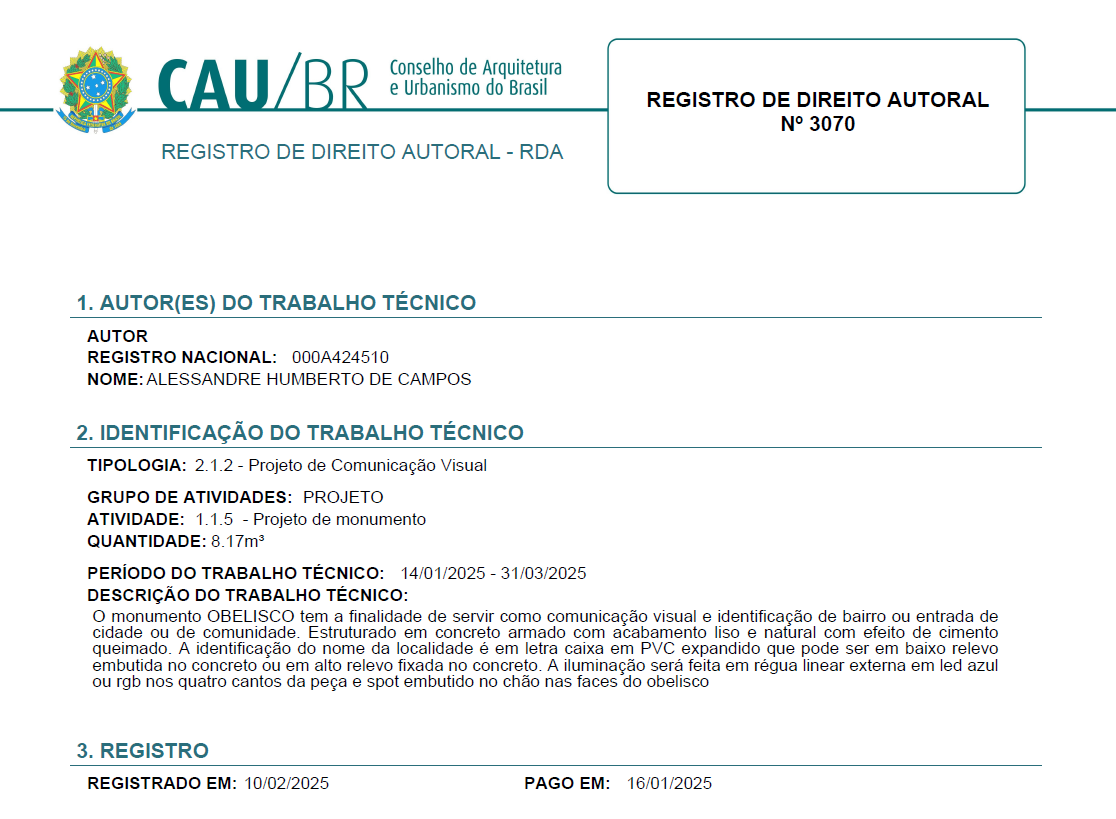 The Obelisk monument, designed by architect and urban planner Alessandre Campos, aims to serve as a visual communication element and a landmark for a neighborhood, city entrance, or community. It is structured in reinforced concrete with a smooth and natural finish, featuring a burnished cement effect.